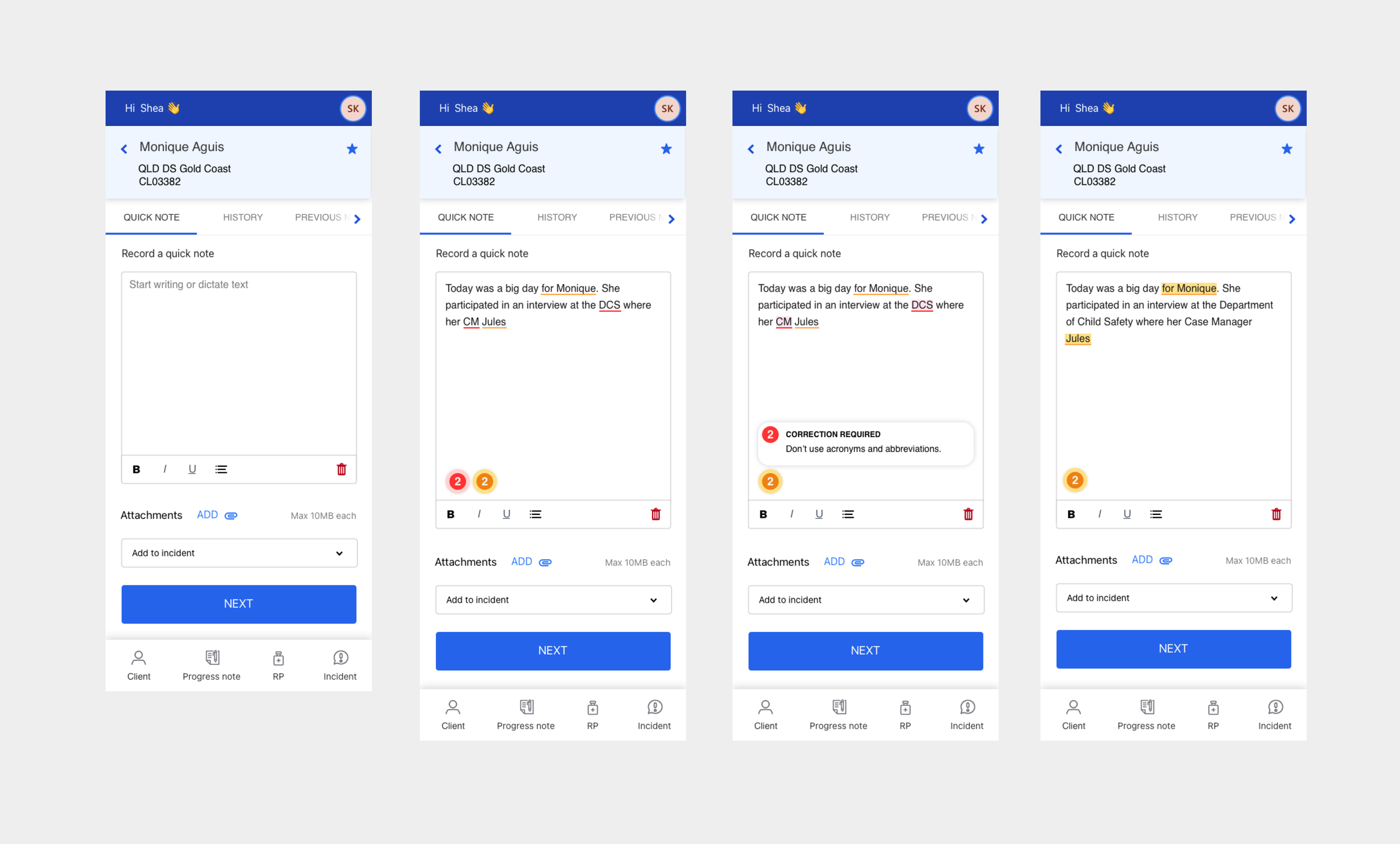 Just before I left the the team, we kicked off a discovery into improving the way how carers take notes. The quality and the language of the notes directly relate to potential life outcomes of the clients, so there are certain rules on how these notes should be recorded. For example: always speak in the second person, provide facts and not opinions, don’t use slang and idiomatic expressions, etc.